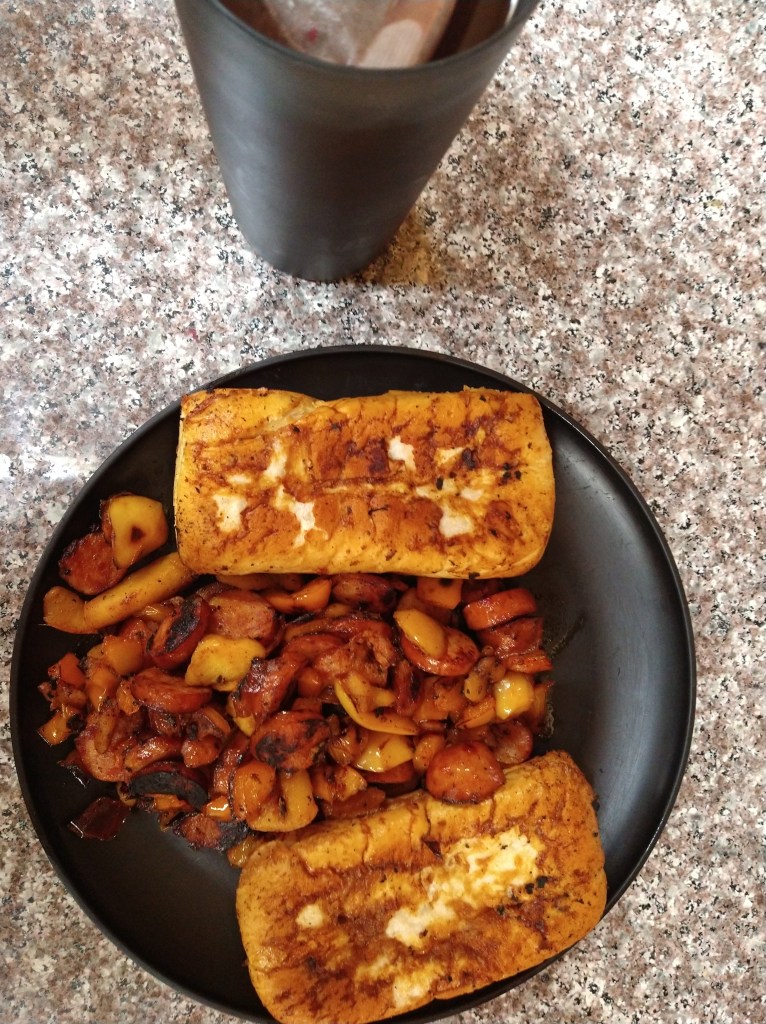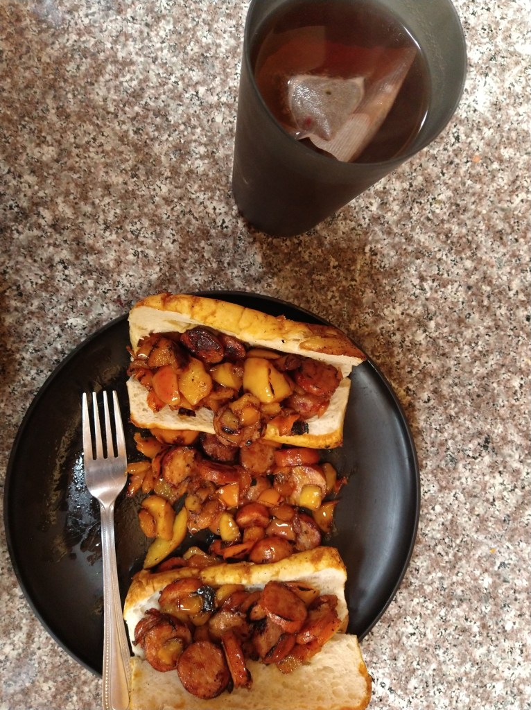 Add three caps of olive oil to a medium skillet on low heat. Add red bell pepper sliced to the pan. Add one apple sliced to the pan. Add two sliced brat sausages to the pan. Add black pepper over the ingredients. Turn until brown on both sides or seared. Place ingredients onto a plate then add a half a cup of red wine vinegar to the medium skillet, add two French buns to the pan, turn until vinegar has cooked into the buns and then turn until brown or toasted on both sides. Add buns to the plate and place ingredients in the buns leaving the remaining ingredients in the middle of the buns. Boil two cups of water over the stove on high heat. Add two raspberry tea bags, one cap of pure vanilla extract and stir until marinated. Afterwards pour tea into a cup and serve with the French Bagel Sausage Sandwich.