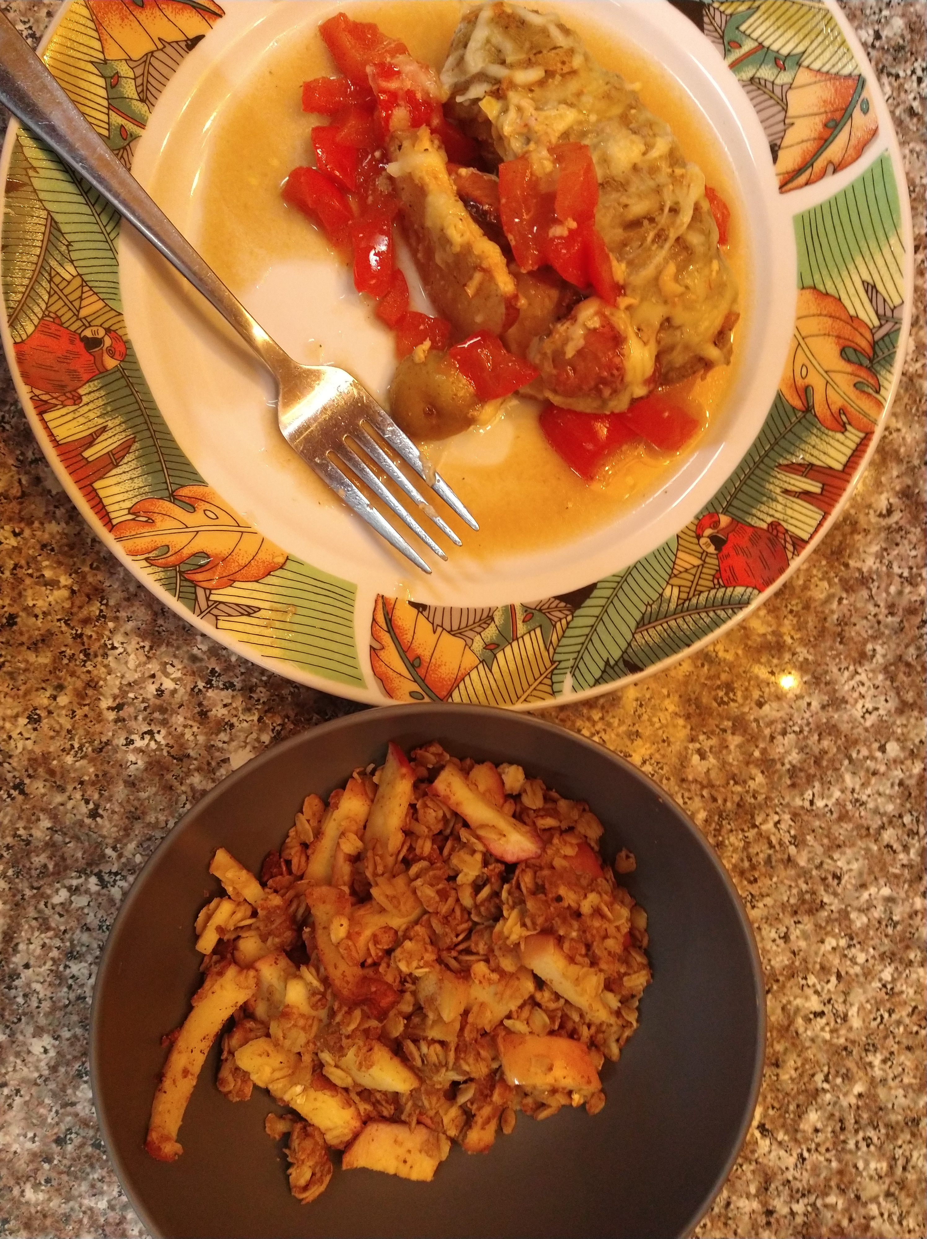 Add two washed sliced strips of whole red bell peppers to a large pan, six washed circle sliced whole potatoes to the pan in a circle around the pan on top of the red bell peppers, add then two washed circle sliced whole apples to the large pan in a circle with the connected potatoes, then add six washed sliced strawberries in the middle of the large pan. After add black pepper and garlic powder around the pan in a spiral, add then Dijon mustard in a one only line spiral, then add red wine vinegar a cup and a half, then add olive oil half a cup, then add balsamic vinegar to the pan touching every portion, then add honey drizzle around a spiral. Then place pan in the oven for one hour. During time period add five cups of oats uncooked, three to four apples in strip slices, one cup of almond butter, and 1/4 cup of olive oil to a large pan, one cap of vanilla extract, & drizzled honey. Then heat over the stove stiring often for five minutes with a lid, and after stirring the ingredients until they’re evenly mixed place in oven for 15 minutes, and when done place on top of the stove to cool. When potatoes are timed up pull them out add one layer of mozzarella and place back in the oven for 5 minutes then pull out of oven and serve the dinner with the dessert. A.HEM LLC. Medicine makes you want dessert. Unfulfilling, but satisfying to the health of the body. Cooking to live is medicine, cooking to eat is dessert, but when you cook to live with the intention of eating good, you satisfy the body with both dessert and medicine. Communion, Ritual, Fast, & Medicines 350° oven.