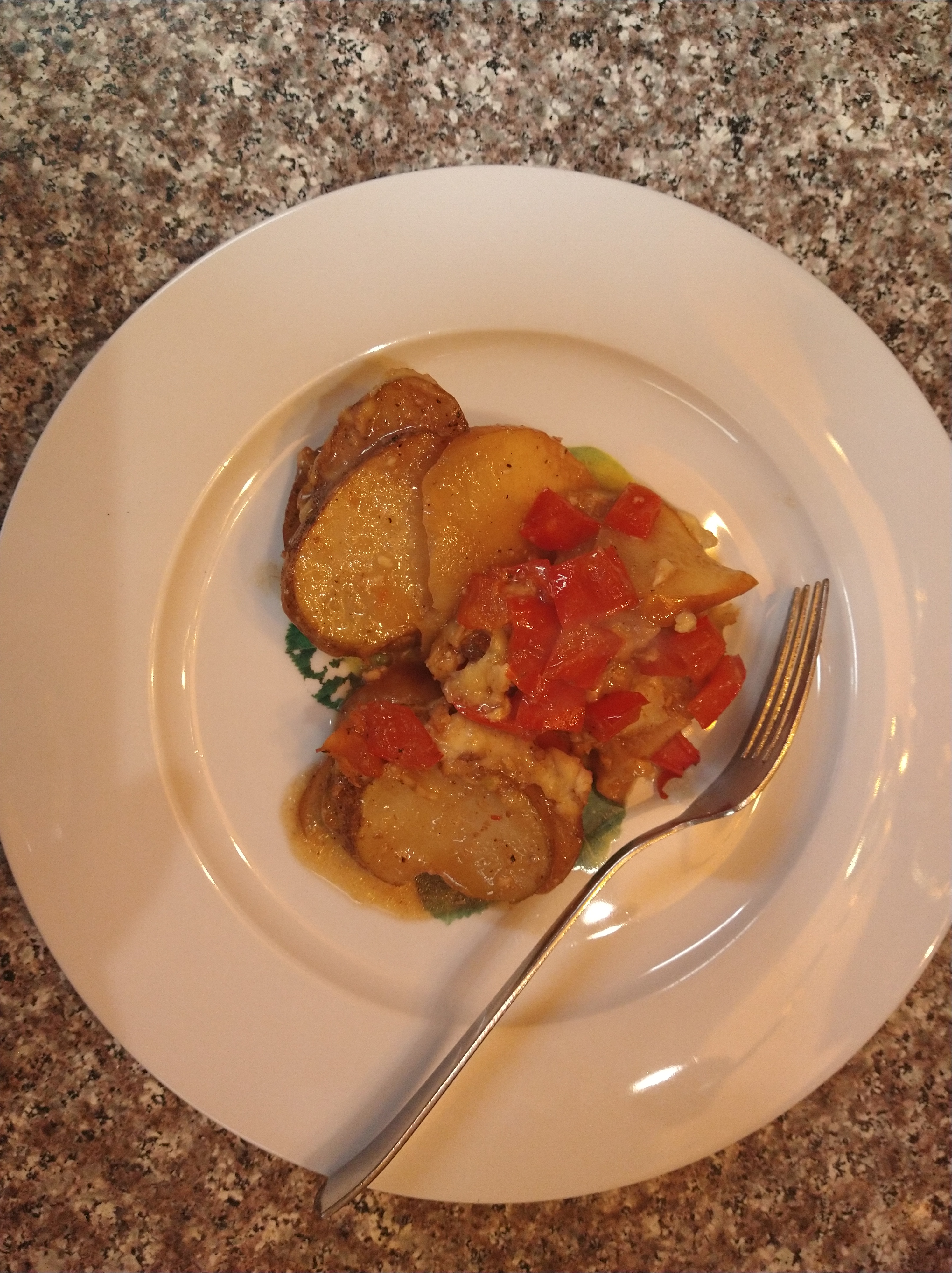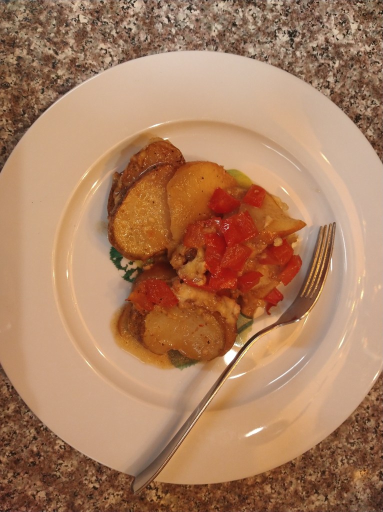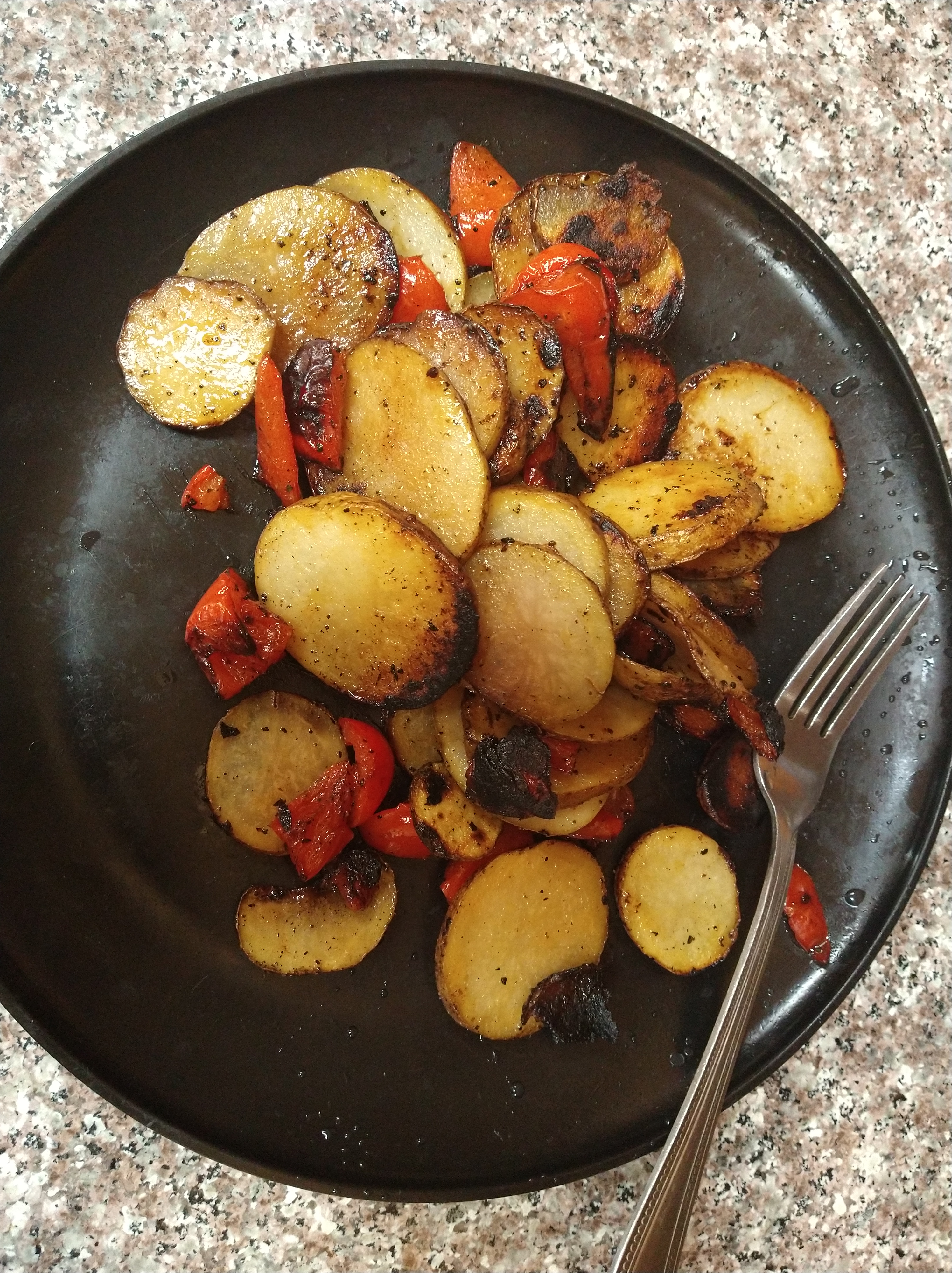 Add two sliced potatoes, a half of a bell pepper, one layer of salt and pepper on both sides, three caps of olive oil to a pan, a cup of red wine vinegar, and turn on medium to low heat with a lid on top of the pan turning often until vinegar is boiled down or for 15 minutes, then add water, half a cup over ingredients, turning often, when water is boiled down or after 15 minutes serve on a plate and enjoy.