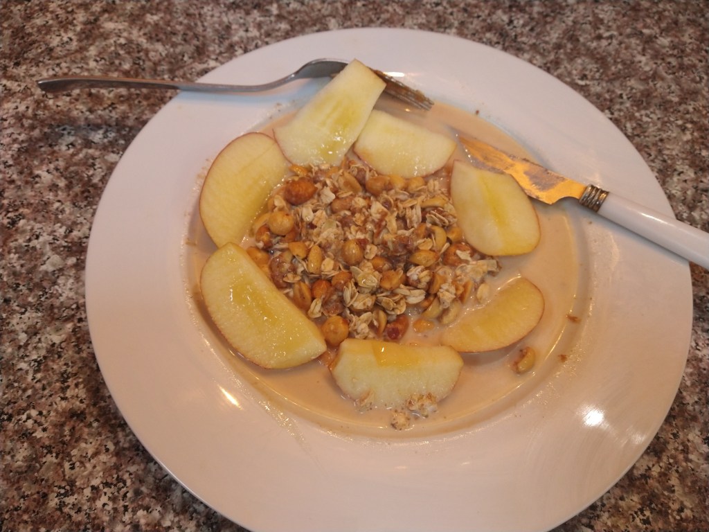 20 minutes in the oven on 350° to reheat the potato ratatouille pizza and serve. Take the remaining milk from the plate, it should be 1/5 of milk from this recipe: Apple Oat Danish Take one apple and slice it in halves, take four tablespoons of almond butter, half a cup of peanuts unsalted, a cup of oats uncooked, and sift the ingredients except the apple slices on the plate with 1/5 of milk on the plate. Sift until the butter blends in with the milk and mixes in with ingredients. Then churn ingredients into a circle in the middle of the plate. After add apple slices around the dish. Almond Apple Berry Tea use the 1/5 milk pouring it into a cup, take two bags of raspberry tea and two cups of water and heat on medium heat on the stove top. After boiling and stirred continuously, pour tea into the cup with the 1/5 milk and stir thoroughly to remove excess thickness of milk, then serve. Forgot to add: add honey on the apples in a circle, add one cap of olive oil on oats and peanut almond mix in the middle and expect enjoyment.