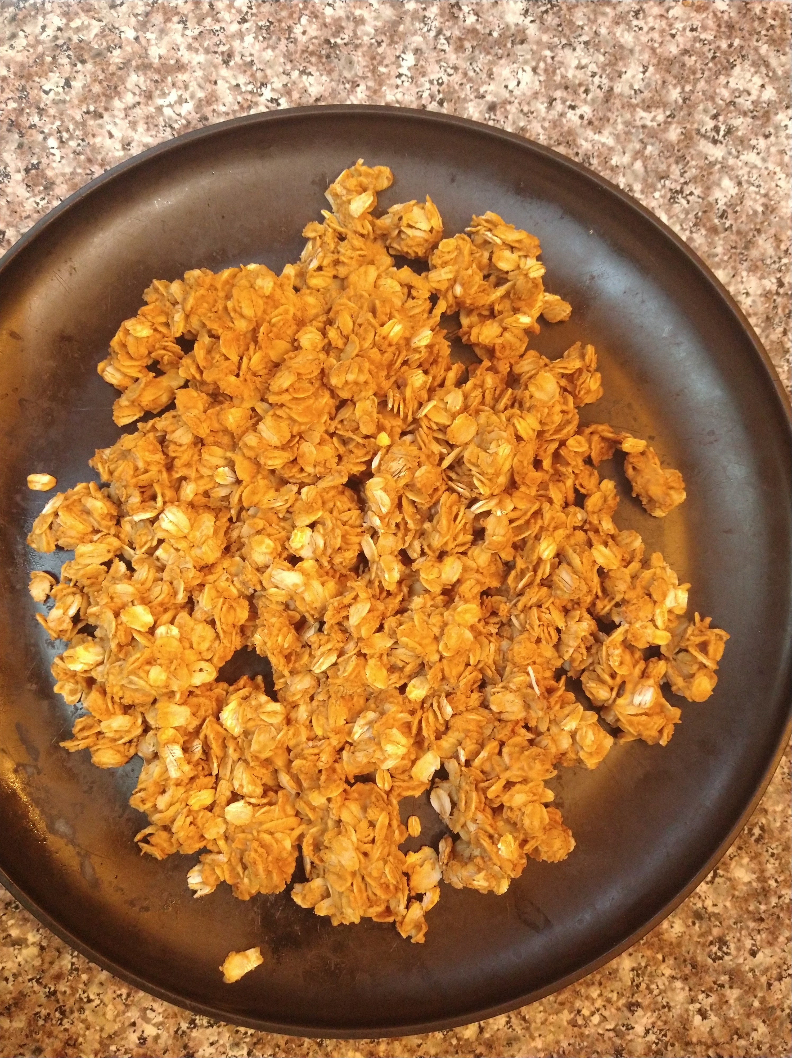 Add 1/4 cup of peanut butter to a pan with 1 cup of oats, turning for 4 minutes on medium heat until ingredients are melted and mixed in together and serve.